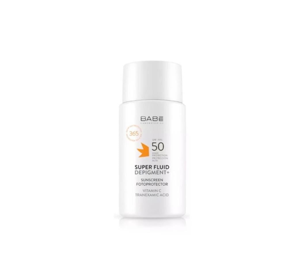 - Babe Super Fluid Depigment+ Sunscreen SPF 50 (50 مل) هو واقي شمسي عالي الحماية مصمم لحماية بشرتك من الأشعة فوق البنفسجية الضارة مع المساعدة في تقليل فرط التصبغ.